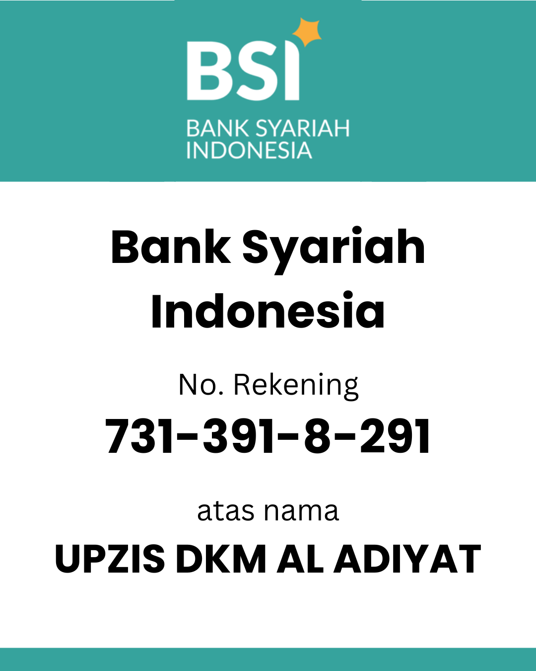 Silakan tunaikan ZIS Bapak/Ibu ke rekening kami di Bank Syariah Indonesia (BSI), nomor rekening 731-391-8-291, atas nama UPZIS DKM AL ADIYAT